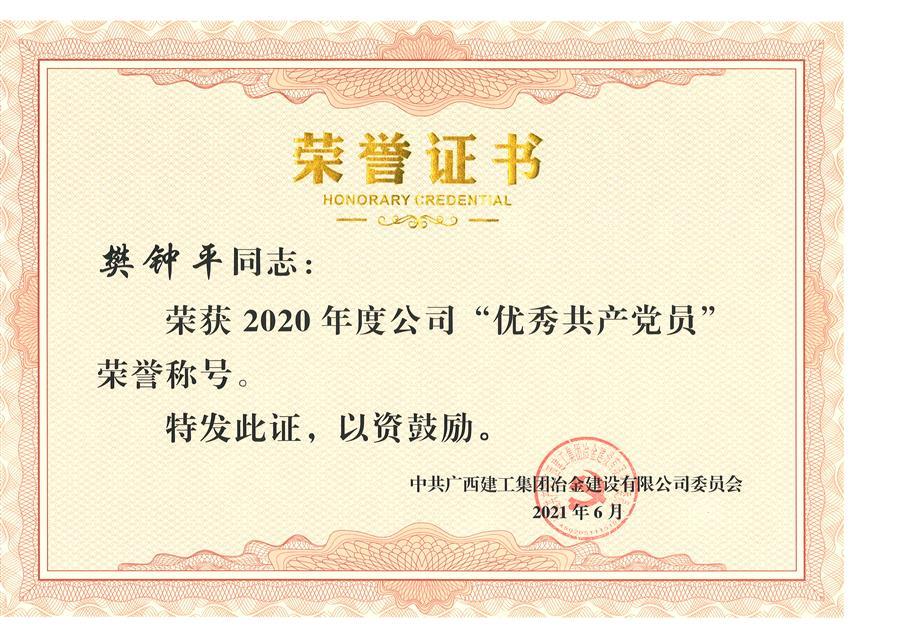 樊鐘平被評(píng)為2020年度冶建公司優(yōu)秀共產(chǎn)黨員