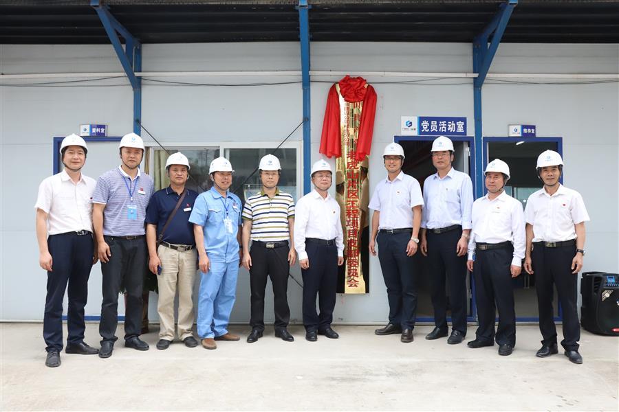 賴海標(biāo)與項目黨支部書記談笑共同為支部成立揭牌