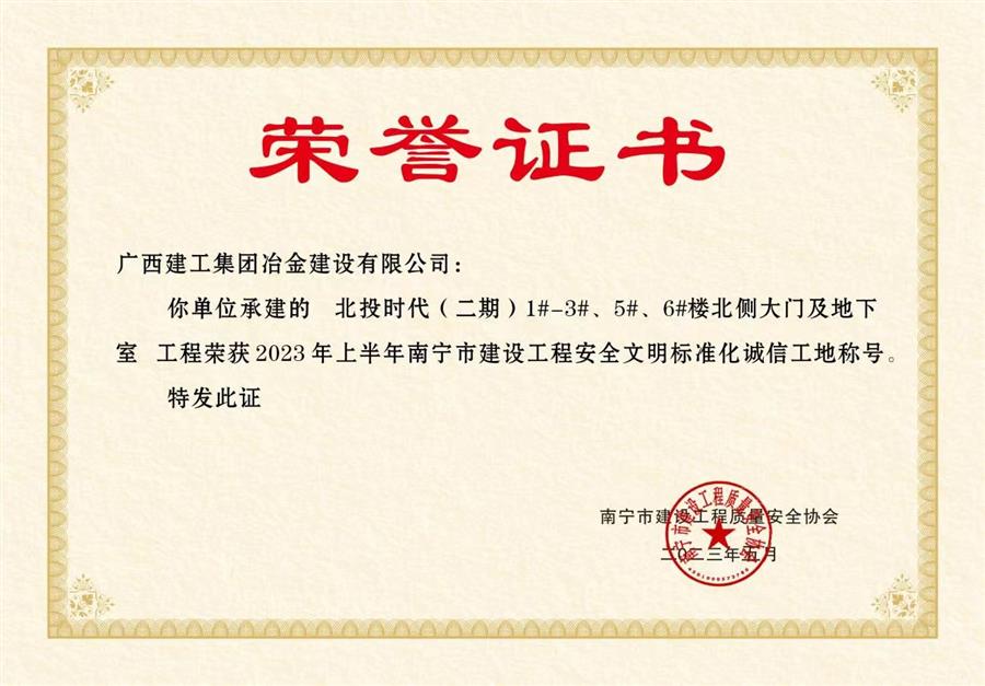 在項目黨支部全體黨員的共同努力下,項目榮獲了業(yè)主頒發(fā)的“2022年度優(yōu)秀總承包單位”和“工程施工類優(yōu)質(zhì)供應(yīng)商獎”獎項,2023年5月項目榮獲2023年上半年南寧市建設(shè)工程安全文明標準化誠信工地稱號。