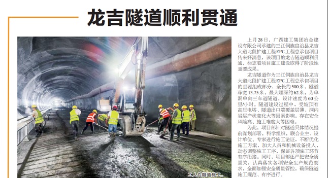 1月2日,《柳州日?qǐng)?bào)》要聞版報(bào)道冶建公司桂海分公司承建的三江縣龍吉大道北段擴(kuò)建工程,龍吉隧道順利貫通,項(xiàng)目建設(shè)取得階段性重要成果。