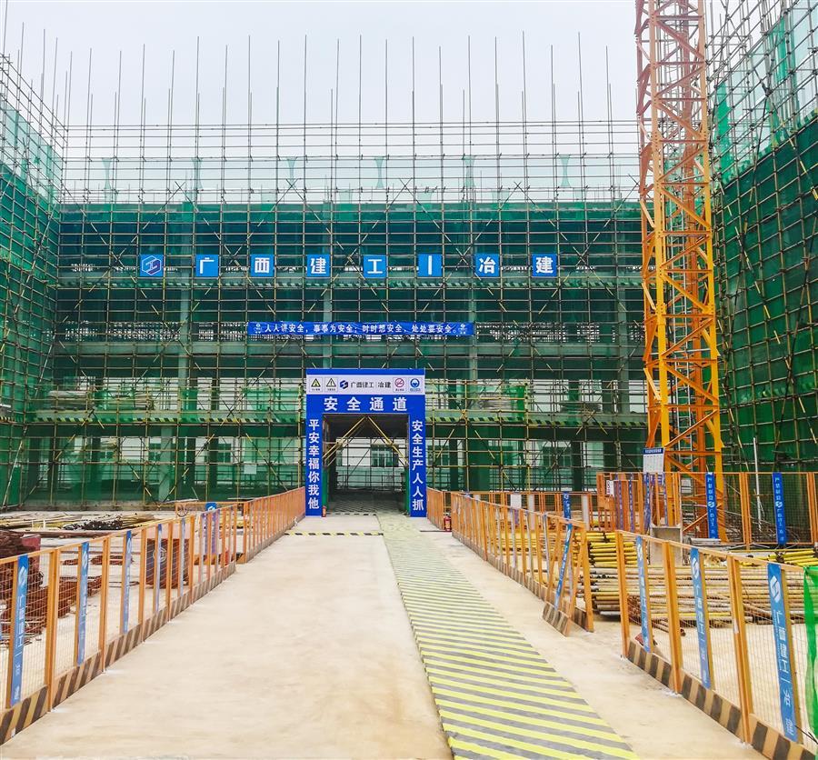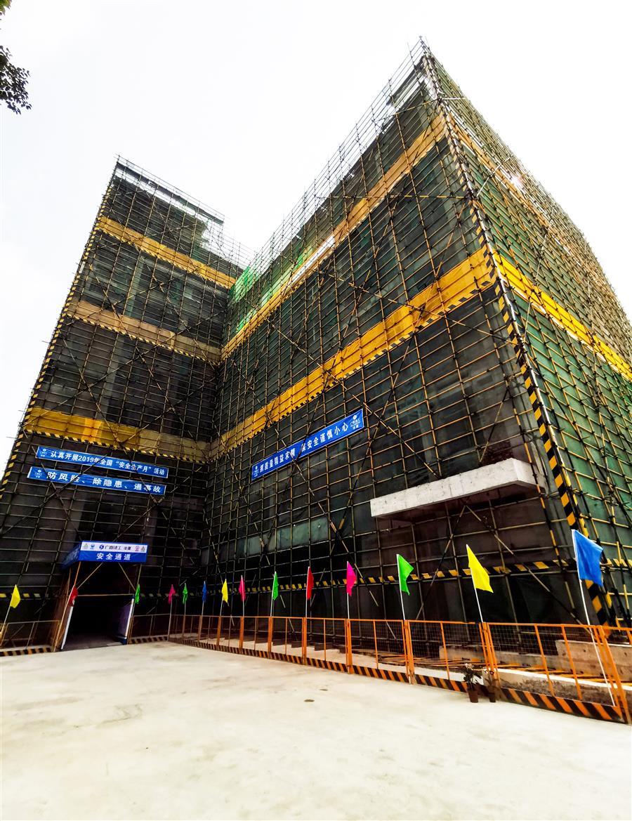 該項(xiàng)目由桂金分公司承建,總建筑面積14993.85平方米,包括1棟9層40.35米高的業(yè)務(wù)綜合樓和1層10.8米高的報(bào)告廳,以及大門(mén)、圍墻、供配電、給排水、道路及地面硬化、擋土墻、綠化、醫(yī)療氣體系統(tǒng)等附屬設(shè)施及電梯等設(shè)備購(gòu)置。目前,項(xiàng)目已完成整體地下室及主樓1~5主體框架結(jié)構(gòu)施工,目前正在進(jìn)行主樓6層內(nèi)架搭設(shè)。