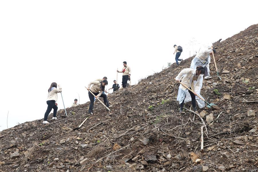活動(dòng)現(xiàn)場,青年志愿者分組分片區(qū)開展植樹活動(dòng)。各小組團(tuán)員青年分工協(xié)作、默契配合,鏟土挖坑、立苗填土,個(gè)個(gè)熱情高漲、干勁十足,活動(dòng)現(xiàn)場氣氛熱烈。經(jīng)過大家熱火朝天的忙碌,一排排新種樹苗有序“落根”,山坡上煥發(fā)出盎然生機(jī)。