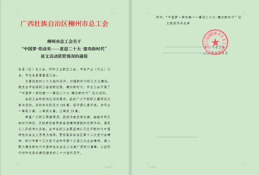 近日,柳州市總工會發(fā)布關(guān)于“中國夢?勞動美——喜迎二十大 建功新時代”征文活動獲獎情況的通報,冶建公司職工作品榮獲三等獎。