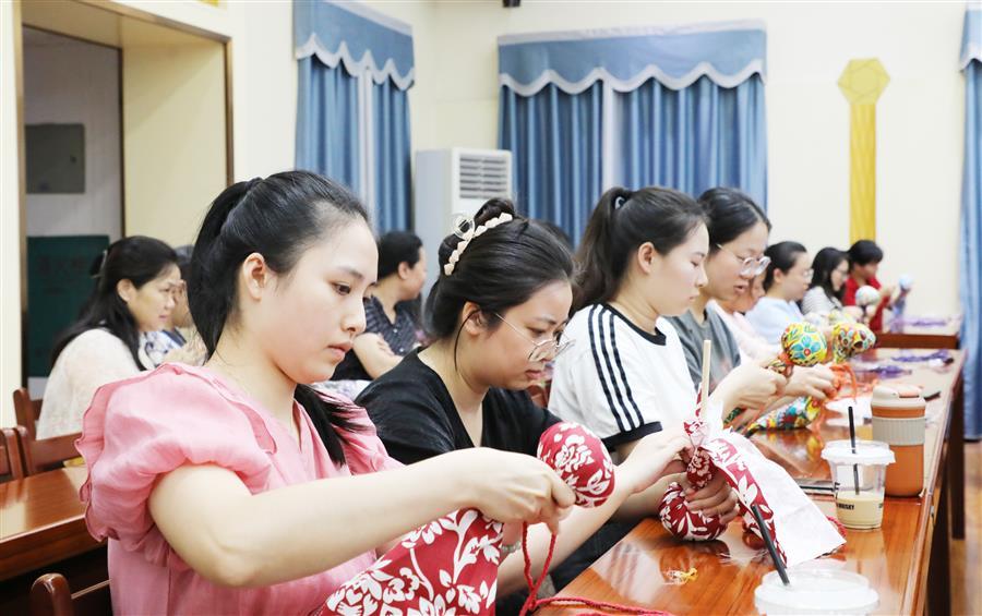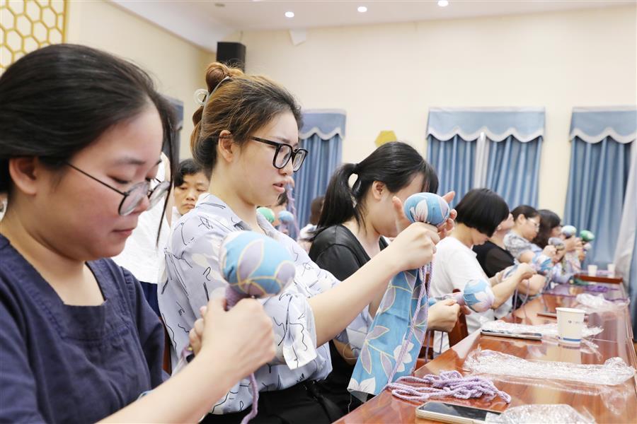 課堂上,培訓(xùn)老師王春梅為大家詳細(xì)講解了艾草養(yǎng)生錘的功效和用途,并演示了其制作方法和步驟。“將錘柄插入艾草包,拉緊艾草包,然后將其放在布料三分之一處,捏成一個緊實的圓球……”在王老師的指導(dǎo)下,女職工們積極參與,跟著老師的指導(dǎo)一步一步地制作自己的養(yǎng)生艾草錘。大家認(rèn)真細(xì)致的聽講并按步驟制作,不久一把把色彩鮮艷、質(zhì)量上乘的艾草養(yǎng)生錘相繼“出爐”。大家互相試用,現(xiàn)場洋溢著歡聲笑語。